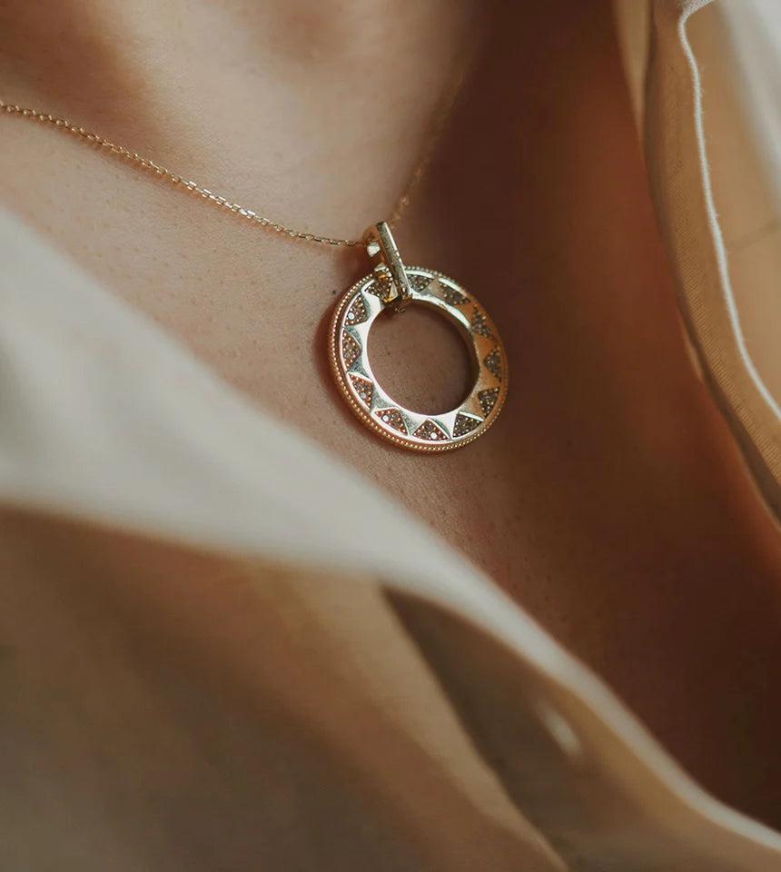 Elevate your everyday elegance with a touch of invisible luxury. Inspired by the concept of Maya (illusion), this necklace features an ultra-fine, "invisible" gold chain that disappears against the neckline, allowing the intricate pendant to...